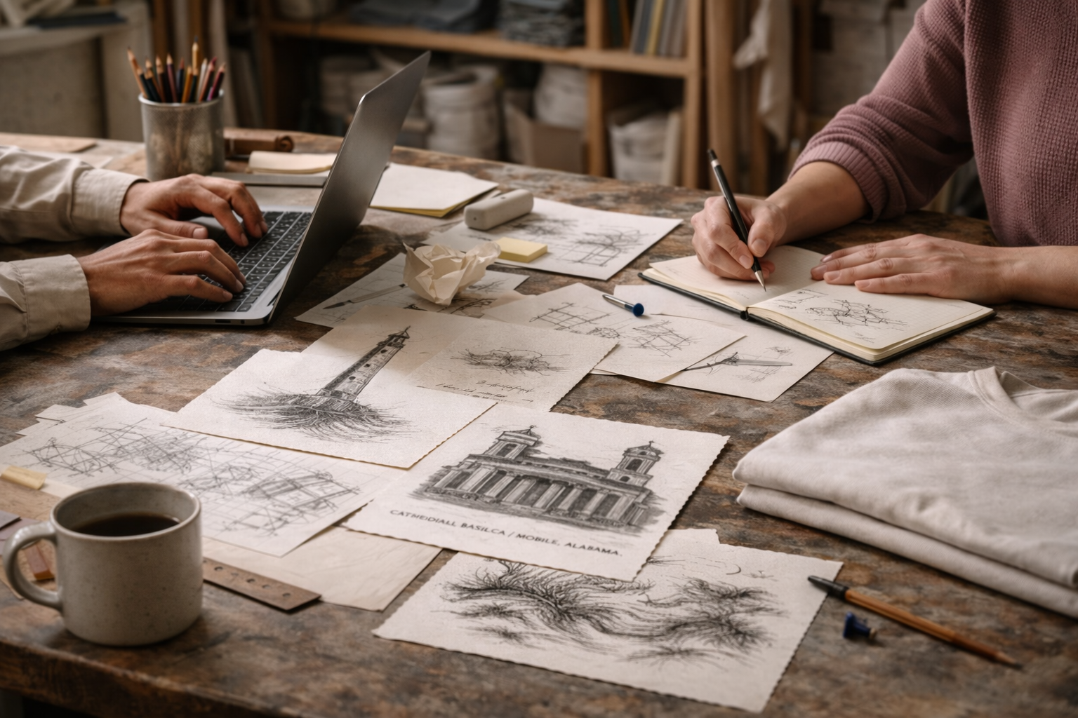 We print apparel, posters, and textiles with intention — combining thoughtful design, quality materials, and hands-on production with love in Daphne, Alabama.